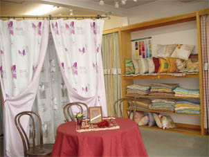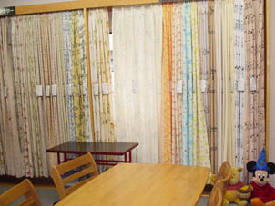 | カーテンなど室内装飾を常設展示しております。 お気軽に、お立ち寄りください。 |  |
